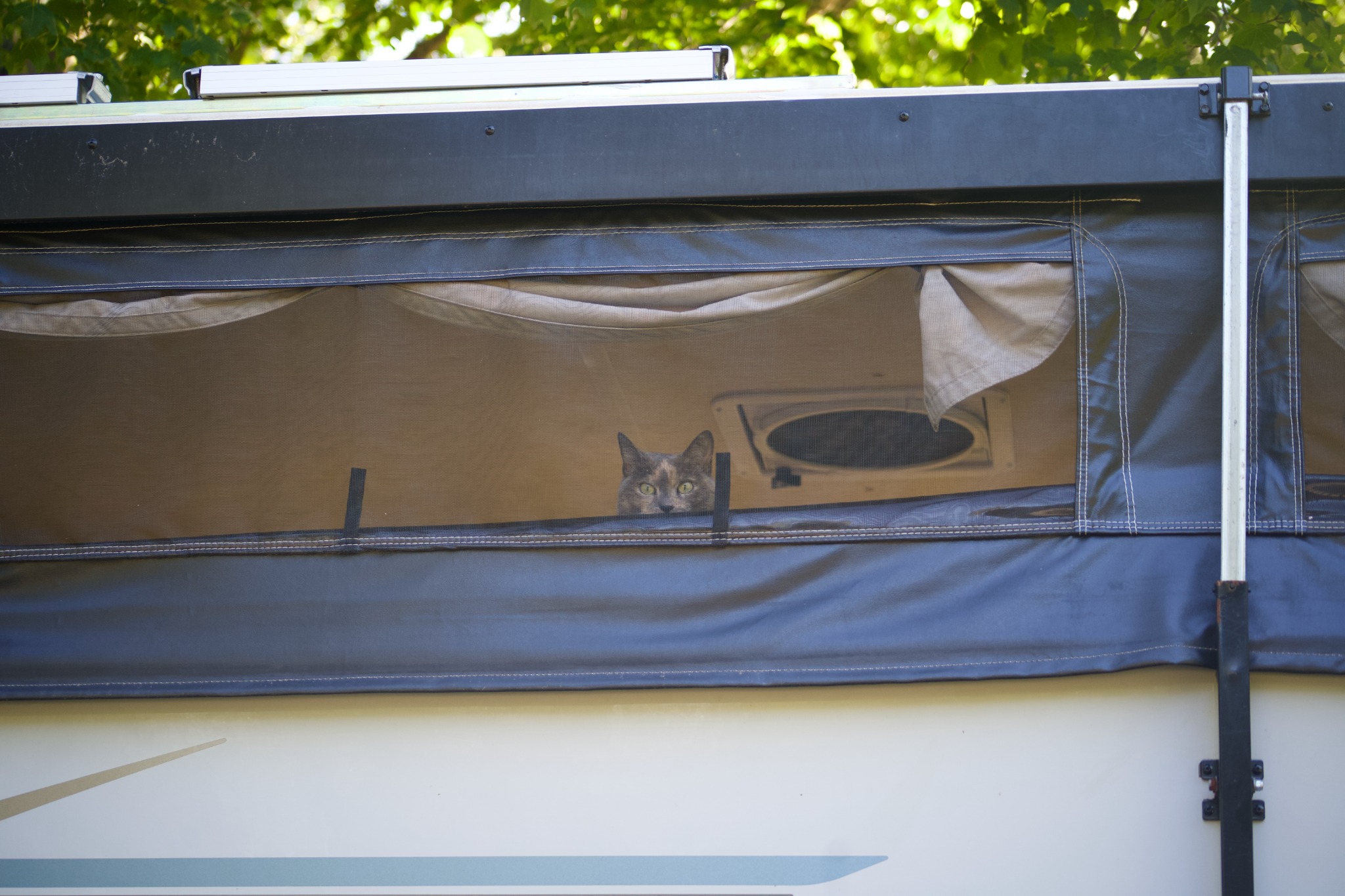 The first big test of the new solar system was our five day trip to Rocky Neck, CT, where the state campground does not offer sites with electric hookups. Compared to Salisbury State Reservation and other RV campgrounds we’ve stayed at, this was like going from the city to the suburbs, spacious campsites clustered around an open field where families played soccer and frisbee. Ben backed the rig smoothly into its spot without me having to get out and scream and wave wildly every time he got too close to an overhanging tree branch, parked car, or unsupervised dog or toddler. At Salisbury, Allie was a little nervous leaving the camper. Although she’s very friendly and well-adjusted, she is a country cat, and prefers not being hemmed in on all sides by unpredictable strangers and their unpredictable dogs. In Rocky Neck, she felt perfectly at home, which is ironic because pets are not technically allowed. She was even unfazed by the flock of Canada Geese who arrived every morning to defecate en masse in front of the bathhouse.