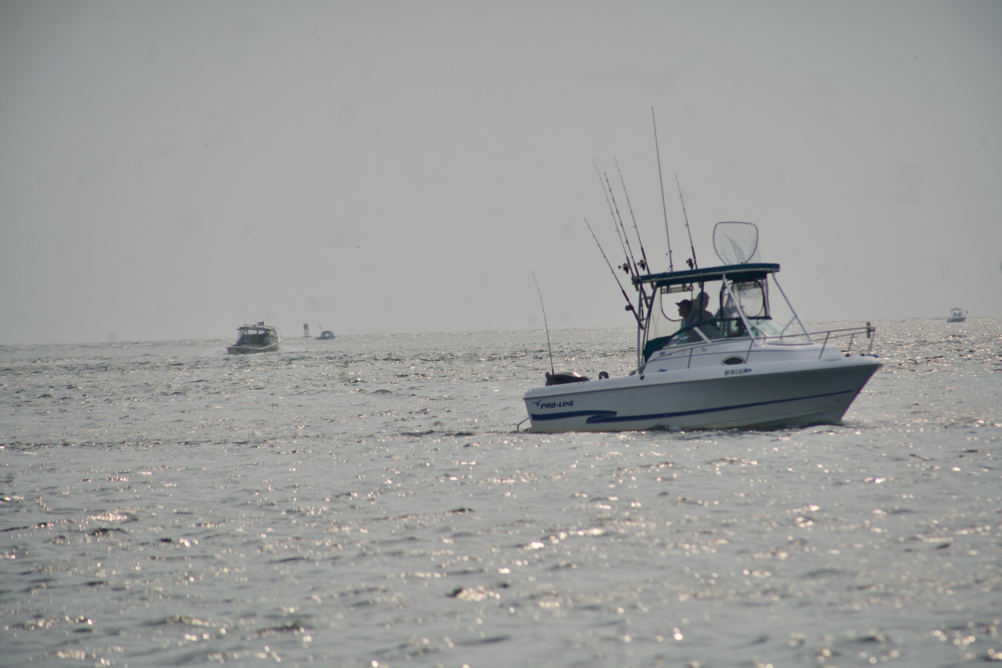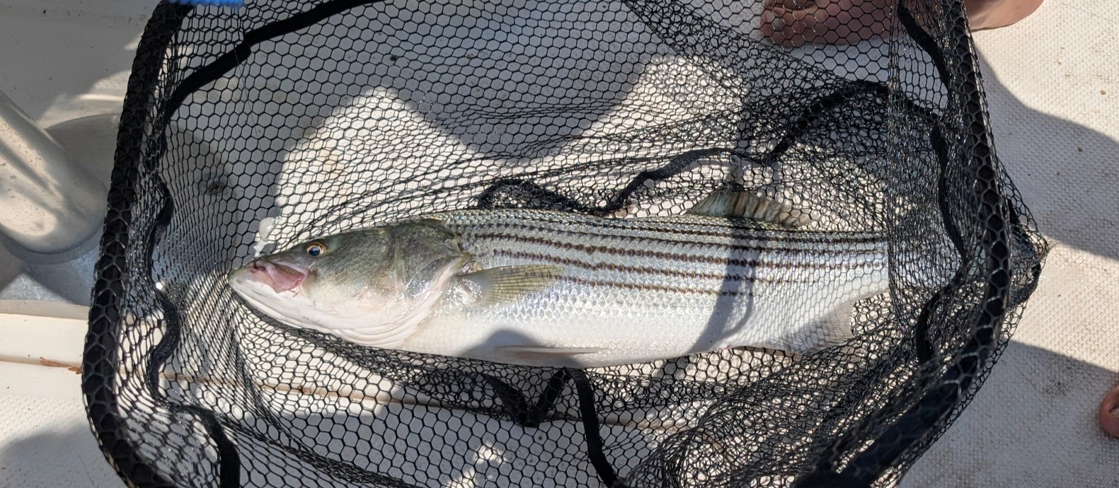 By the next day the conditions improved enough to go fishing. We drifted back and forth between the north jetty and the state reservation beach – the Salisbury Triangle of Bass Fishing Disappointment. Gay umbrellas dot the sand and beachgoers innocently frolic a few hundred feet away fishermen pursue 27-31-inch-long stripers as if they were Moby Dick (anything bigger or smaller is illegal to keep). We didn’t catch one until our very last day, on our very last drift. And no, I don’t have video, because I had to net the fish while Ben reeled it in.
